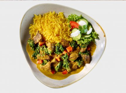 Zartes Rindfleisch, serviert in einem mit Ingwer, Knoblauch und Koriander verfeinertem Spinat-Curry, inklusive Basmati-Reis.