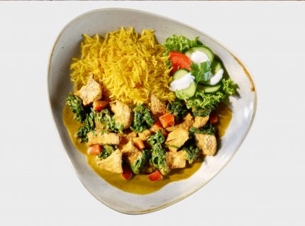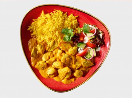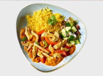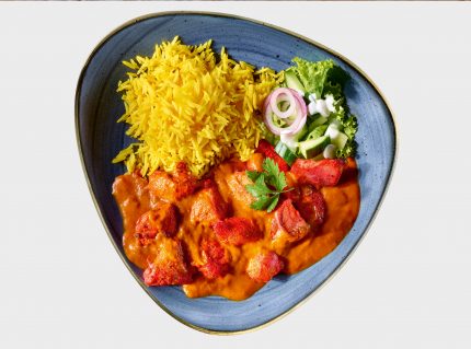Gegrillte Tandoori Chickenfilet Stücke im milden Tomaten-Curry, inklusive Basmati-Reis.